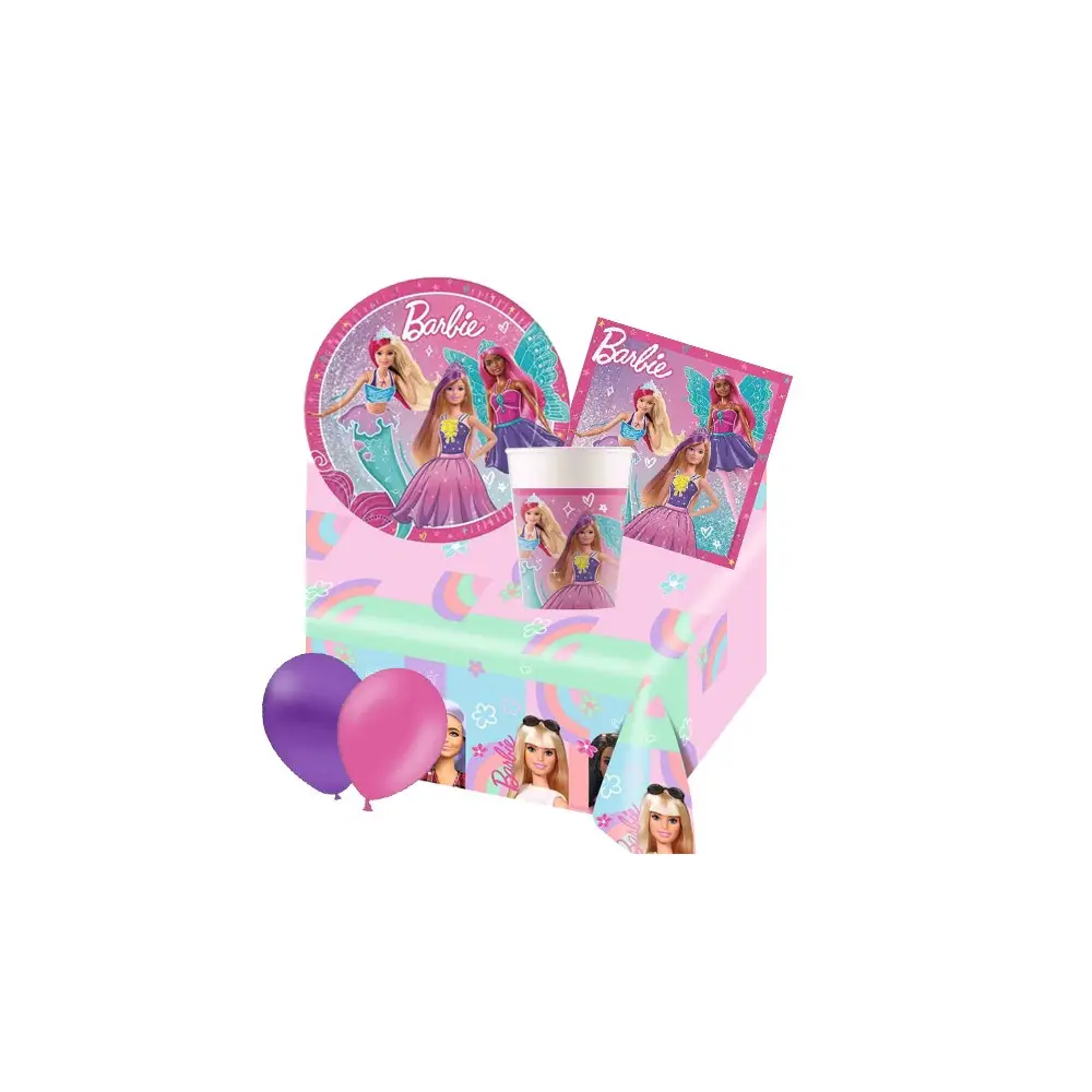 La vostra bambina è una grande appassionata di Barbie? Allora scegliete un set tavola a tema per il suo compleanno! Questo da noi proposto è per otto persone e comprende: 8 piatti, 8 bicchieri, 20 tovaglioli, una tovaglia, 2 fluffy colorati da appendere, 10 palloncini fucsia e 10 palloncini viola