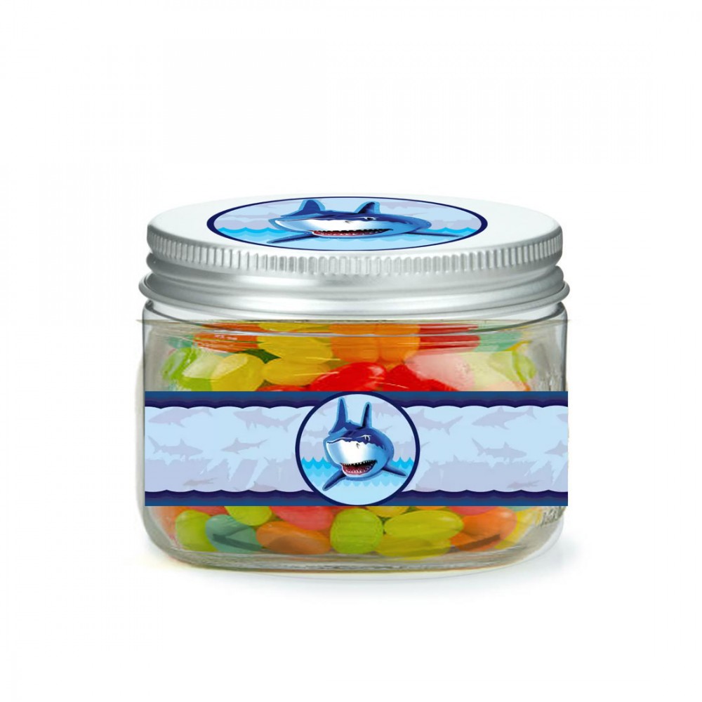 Una festa a tema squali è perfetta se alla fine si regalano dei gadget a tema. Noi abbiamo pensato a : 10 barattolini di vetro a cui applicare 20 adesivi con stampa di squali e riempire con 1 kg di jelly beans, caramelle gelatinose