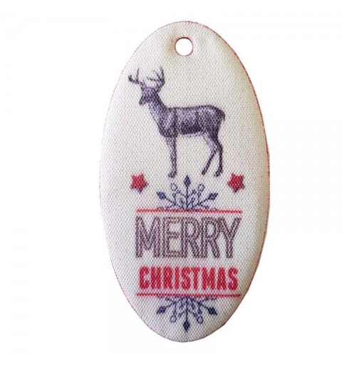 Una confezione da 18 targhette ovali di stoffa beige con la stampa di renna e la scritta "Merry Christmas". Hanno un piccolo foro nella parte superiore per permettervi di appenderle. Codice: 5254