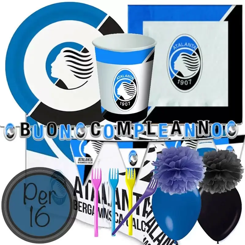 Un bellissimo kit completo di tutto il necessario per organizzare una festa Atalanta: 16 piatti, 16 bicchieri, 40 tovaglioli, una tovaglia, bandierine, ghirlanda, 3 fluffy di carta, 1 confezione di posate in legno, 20 palloncini in lattice