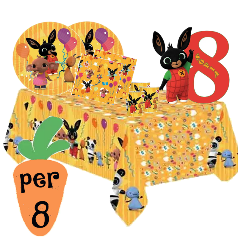 Bellissimo coordinato tavola con stampa di Bing e dei suoi amici: 8 piatti di cartoncino, 82 bicchieri, 16tovaglioli una tovaglia, 1 carinissima sagoma in polistirolo personlizzabile.
