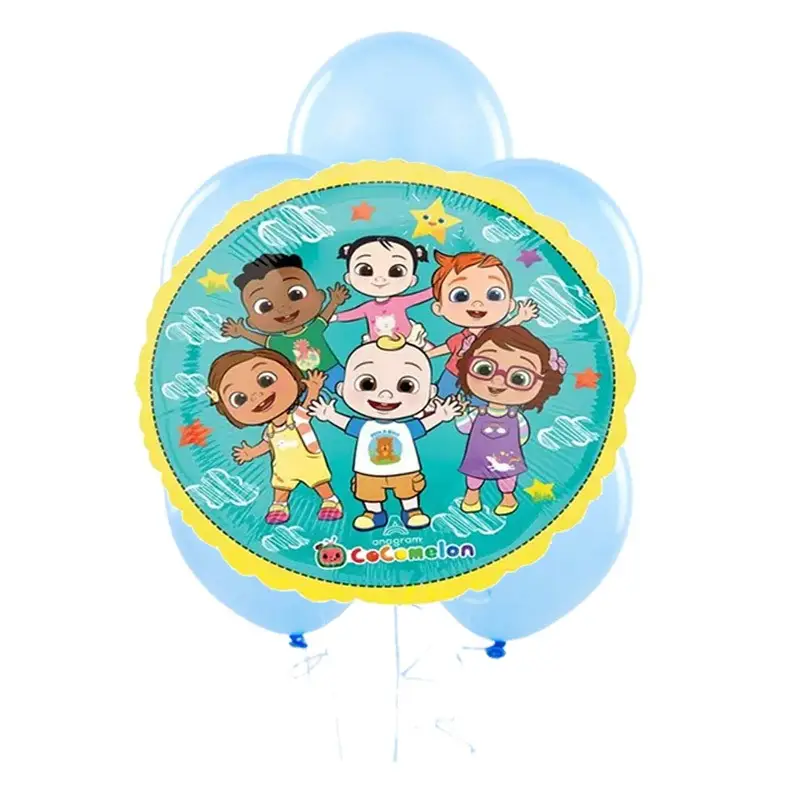 Una composizione bellissima con un protagonista d'eccezione: Cocomelon ! Riceverete un supershape Jumbo Cocomelon, 15 palloncini celesti , nastrino per tenere insieme la composizione e un pesetto, utile nel caso in cui vorrete gonfiare i palloncini con l’elio!