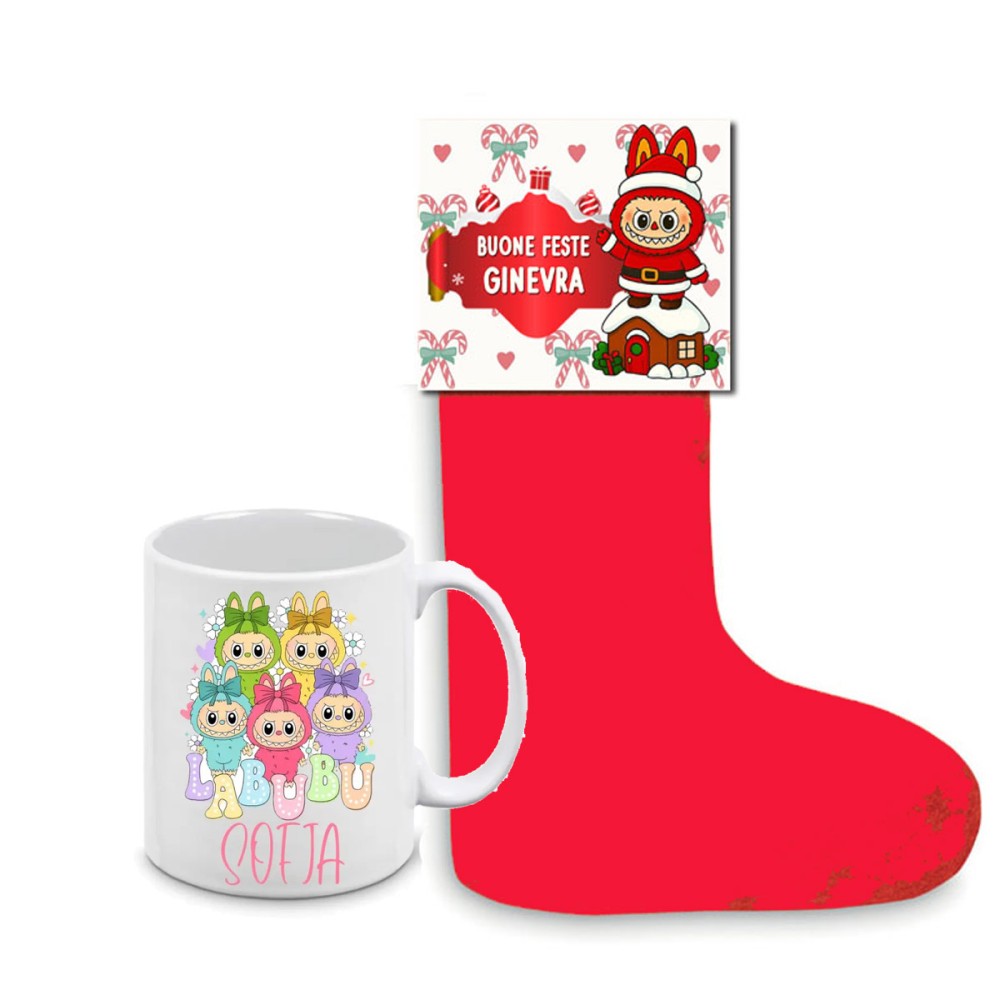 Calza della befana Labubu con etichetta e tazza personalizzabili