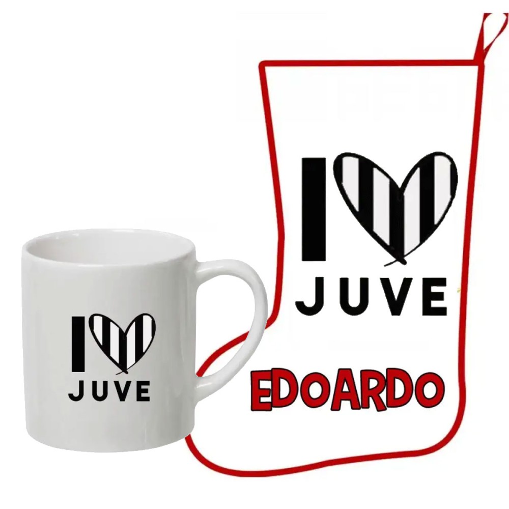Un’idea originale e bella per rendere speciale il natale dei tuoi bimbi tifosi della Juventus! Calza 30 cm x 48 cm h e tazza in ceramica personalizzabile con nome o testo a scelta. Per rendere l'epifania allegra e unica, regala anche tu questo set a tutti i fans della squadra di Torino.