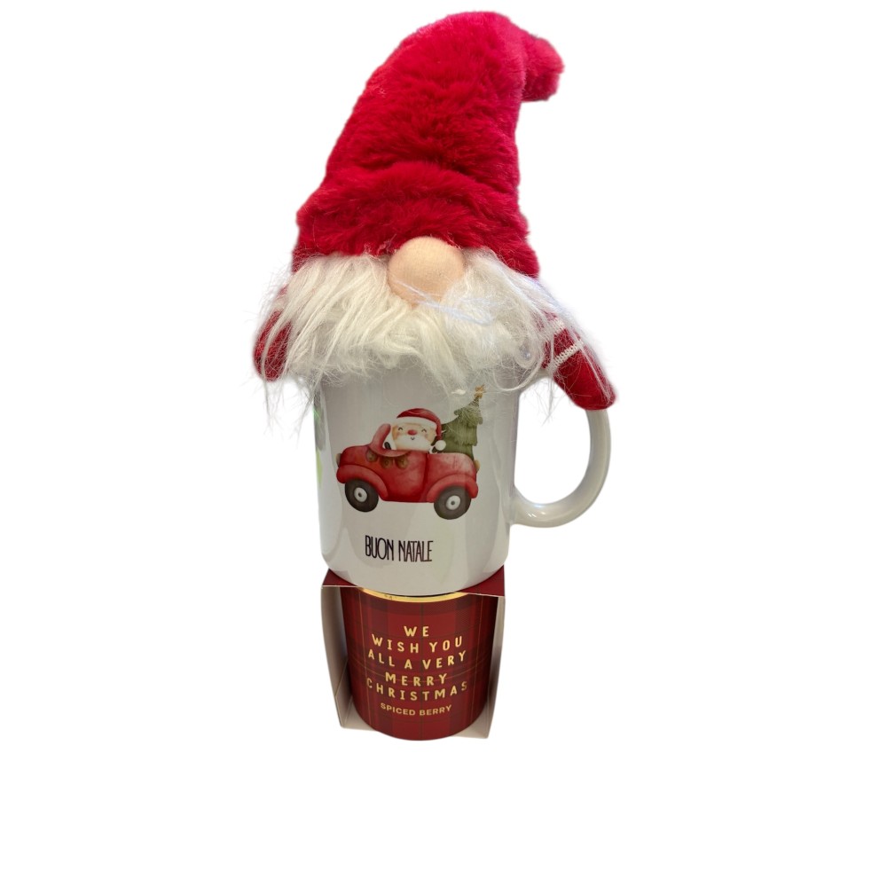 Una bellissima confezione regalo composta da una candela natalizia + una tazza mug in ceramica a tema natalizio e un bellissimo gnomo con la punta del cappello luminosa!! tutto confezionato in un foglio cellophane!