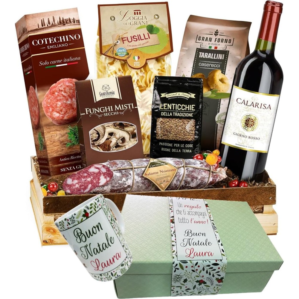 Una bellissima confezione regalo personalizzabile con il nome dei nonni sia sul coperchio della box regalo sia sulla mattonella, ricca di prodotti della tradizione! un regalo natalizio ottimo per i nonni!