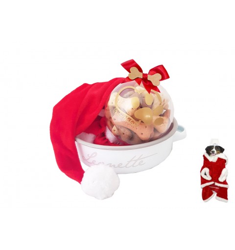 Una bellissima idea regalo per i vostri amici a 4 zampe: una ciotola "Leonette", una confezione di biscotti per cani, una sfera in plastica trasparente, nastro di raso rosso decorativo, vestito di Babbo Natale per cane.. Scorri la pagina per maggiori dettagli