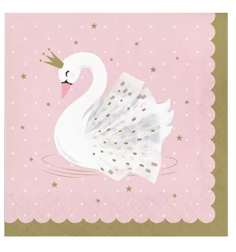 Un bellissimo coordinato tavola perfetto per il compleanno di una bimba, si caratterizza per il colore rosa tenue di fondo con grafica di di un cigno: