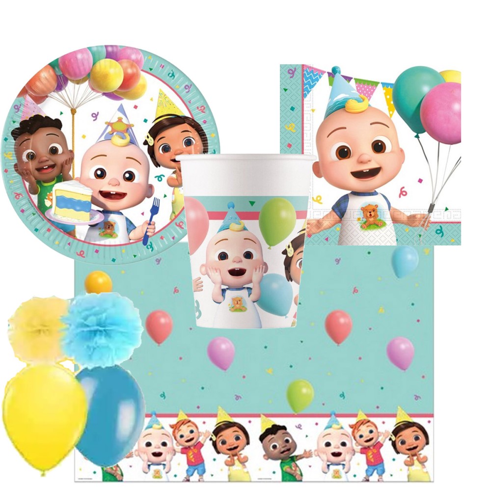 Un bellissimo coordinato tavola perfetto per un compleanno a tema cocomelon: 8 piatti, 8 bicchieri e 20 tovaglioli di carta, una tovaglia gialla, 2 fluffy 20 cm in carta, 20 palloncini.