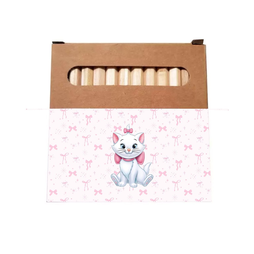 Per una festa ballerina davvero speciale, avrete bisogno di regalini fine festa altrettanto speciali, proprio come questi da noi proposti: 10 astucci in cartoncino avana con 12 mini pastelli ognuno a cui applicare 10 etichette rosa e bianche con stampa di Minù gattina Marie.