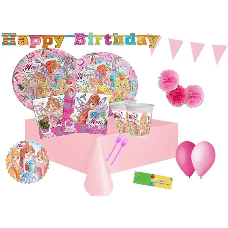 Riceverete il necessario per un compleanno a tema Winx: 32 piatti grandi, 32 bicchieri, 40 tovaglioli, una tovaglia, bandierine, ghirlanda, 3 fluffy pompon, 40 palloncini in lattice, posate.