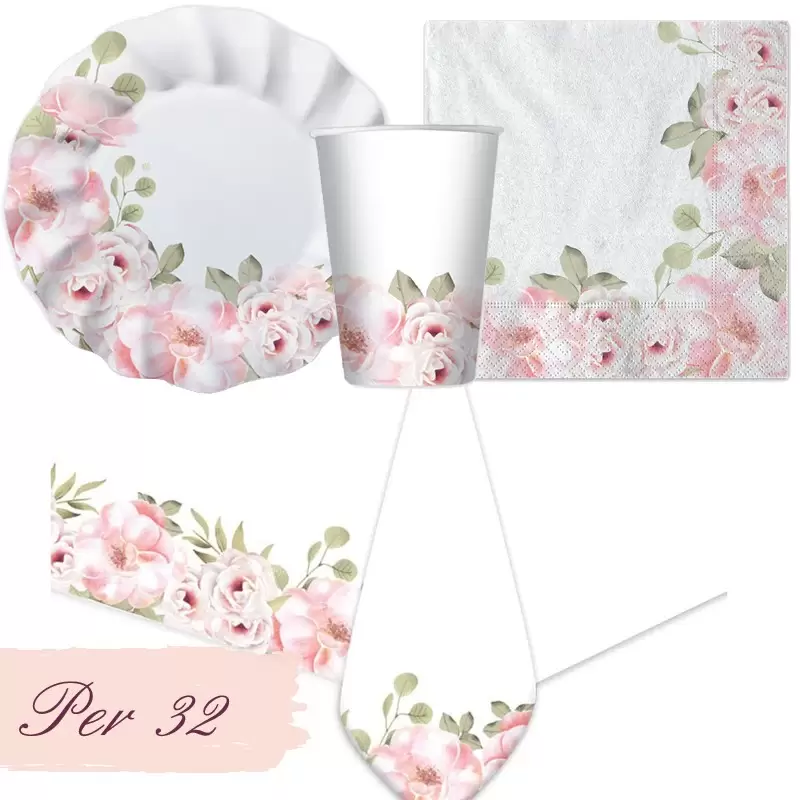 Un bellissimo set tavola a tema floreale: 32 piatti, 32 bicchieri, 40 tovaglioli, una tovaglia