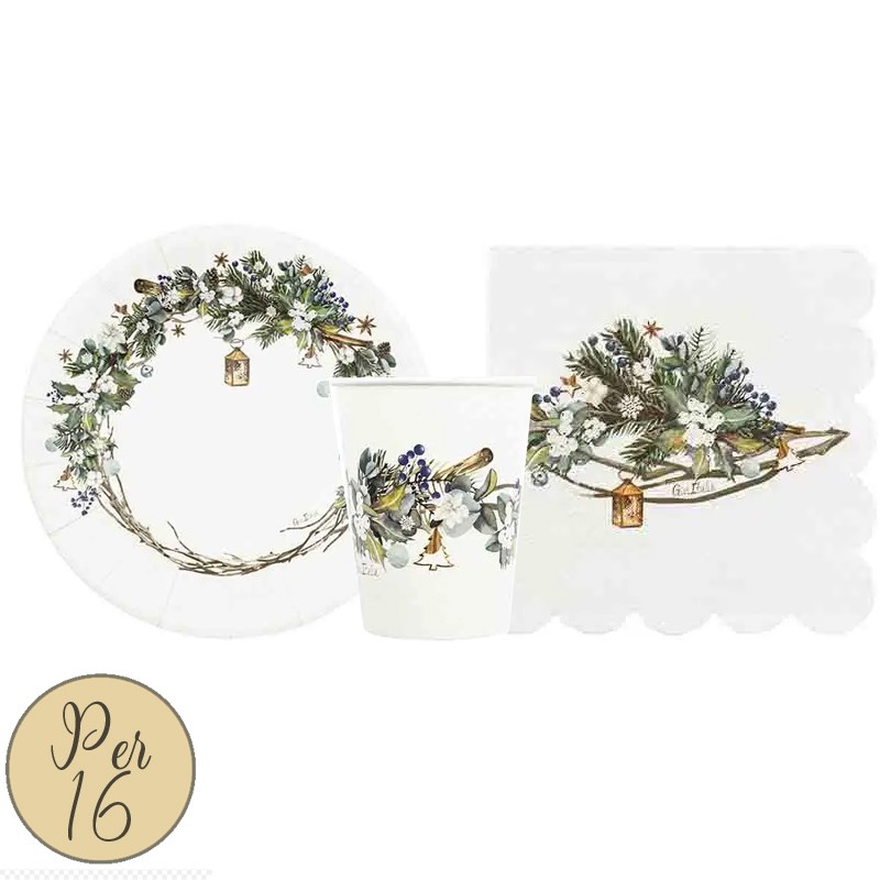 Un bellissimo coordinato tavola natalizio: 16 piatti, 16 bicchieri, 32 tovaglioli..