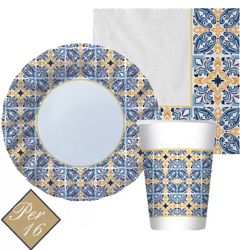Un bellissimo kit festa maioliche di Positano composto da: 16 piatti grandi, 16 bicchieri e 40 tovaglioli di carta..