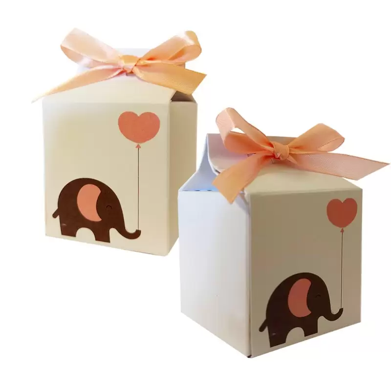 Una bellissima scatolina in cartoncino tema elefantino rosa. La scatolina misura 5,5 cm di base, 6 cm di altezza (esclusa la parte superiore dove va inserito il fiocco) e può esser chiusa con una seplice colla. Il nastrino NON è incluso.