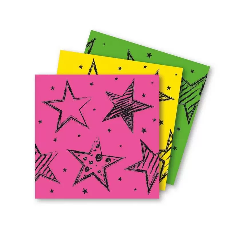 Riceverete una confezione da 16 tovaglioli di carta da 16,5 x 16,5 cm rosa fluo su un lato e giallo o verde fluo dall’altro lato, sistemateli come meglio preferite per far vedere il colore che più vi piace! Con stampa di stelle nere