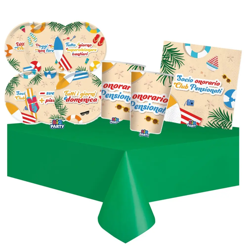 Un bellissimo coordinato tavola perfetto per una festa di pensionamento: 30 piatti in cartoncino alimentare da 18 cm, 30 bicchieri, 32 tovaglioli e una tovaglia verde di plastica