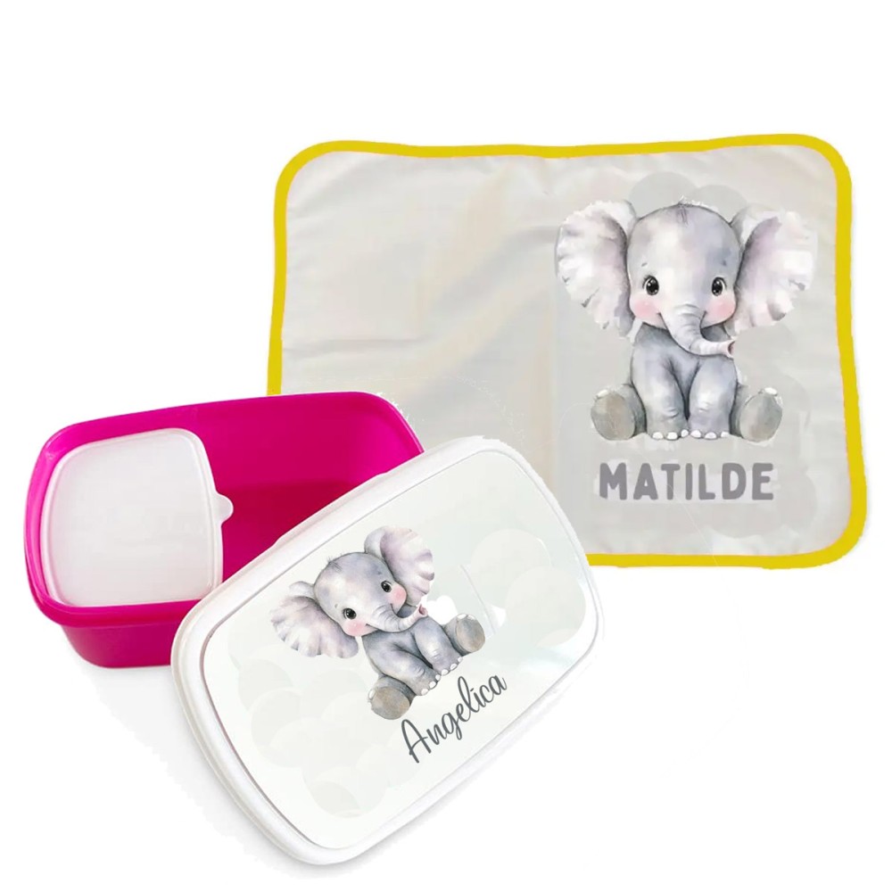 Tovaglietta americana in cotone 48 x 35 cm circa + Box portavivande o portamerende in plastica con divisorio per cibi fucsia. Misure: 18x12 h 5,5 cm. Indicaci il nome per personalizzare il prodotto.