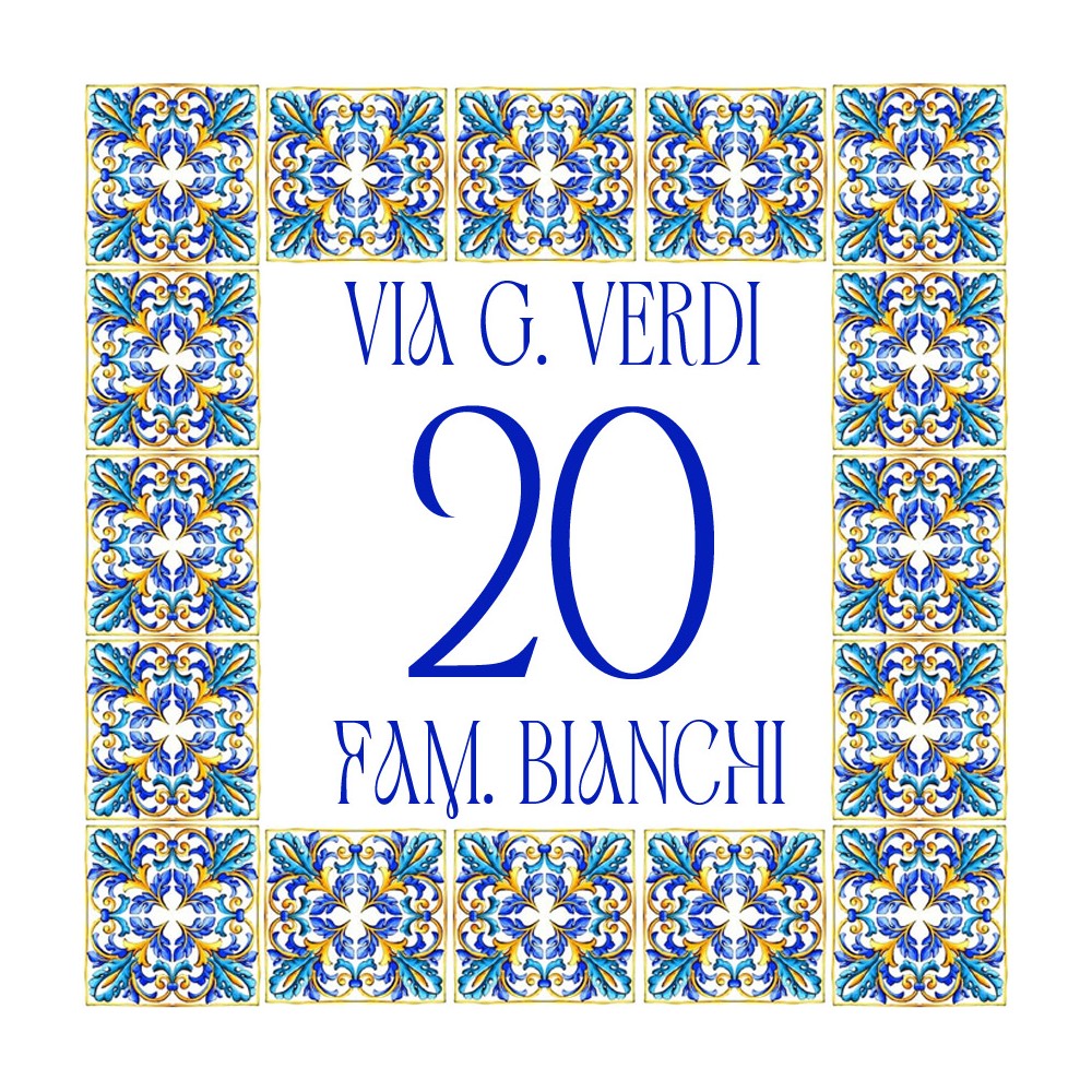Mattonella numero civico personalizzato da esterno con via, nome famiglia, con numeri e lettere. Mattonella personalizzabile in ceramica colore bianco ultra-white e design moderno e originale stampato con inchiostri di altrissima qualità resistenti nel tempo ai raggi solari UV e alle intemperie. Dimensione della targa 15,2x15,2 cm e spessore 0,5 cm. Applicazione facile con colla per piastrella o silicone. Stile maiolica ispirato alla costiera di Amalfi! indicaci la personalizzazione prima di concludere l'acquisto!