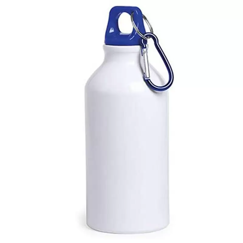 Una borraccia da 400 ml bianca di alluminio con tappo e moschettone blu. Codice: 6456