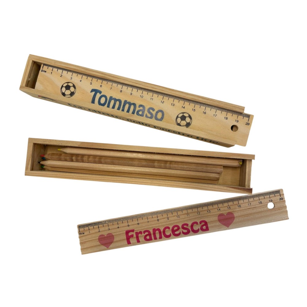 5 bellissime confezioni in legno con 6 matite colorate chiude da un righello, personalizzabili con testo. Ideali come regalini fine festa o segnaposto per eventi in genere. Indicaci il testo che preferisci per la personalizzazione nel box! Consegna in 4/5 giorni lavorativi !