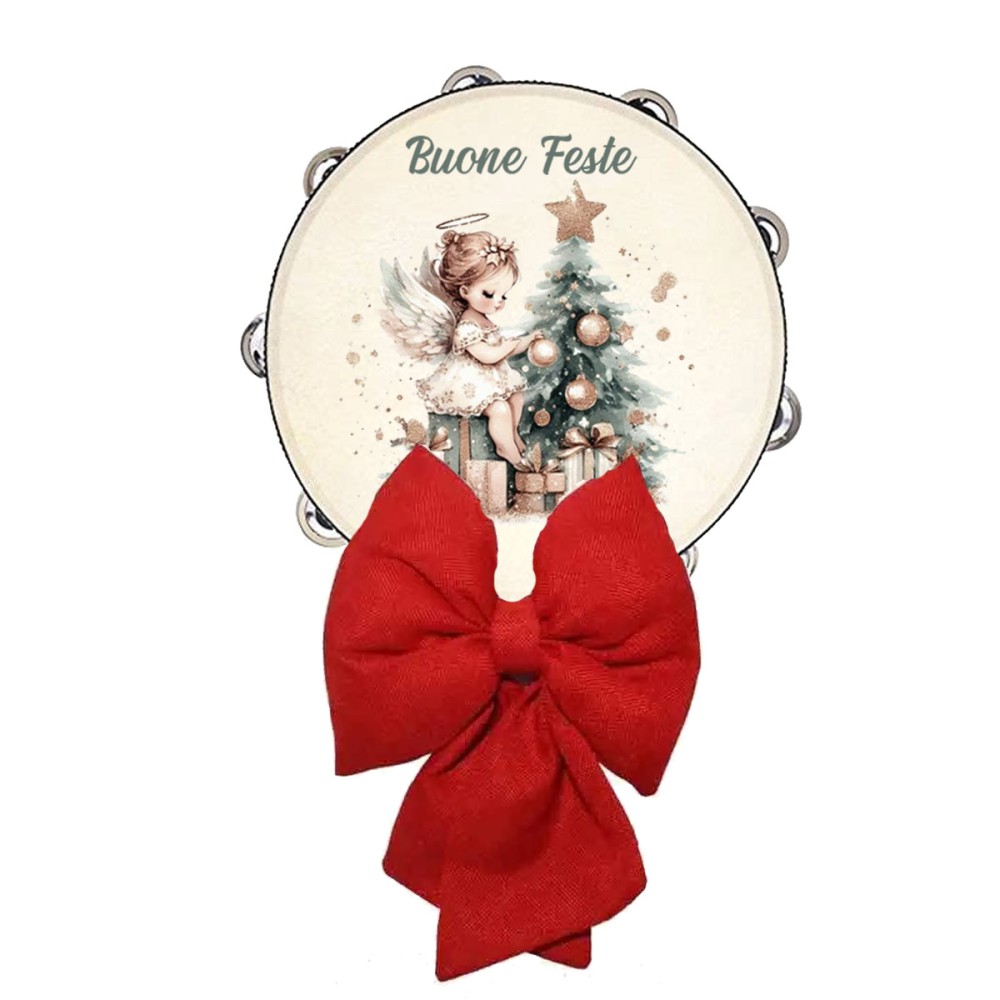 Tamburello personalizzabile 21 cm tema natalizio con fiocco rosso 22 cm circa.