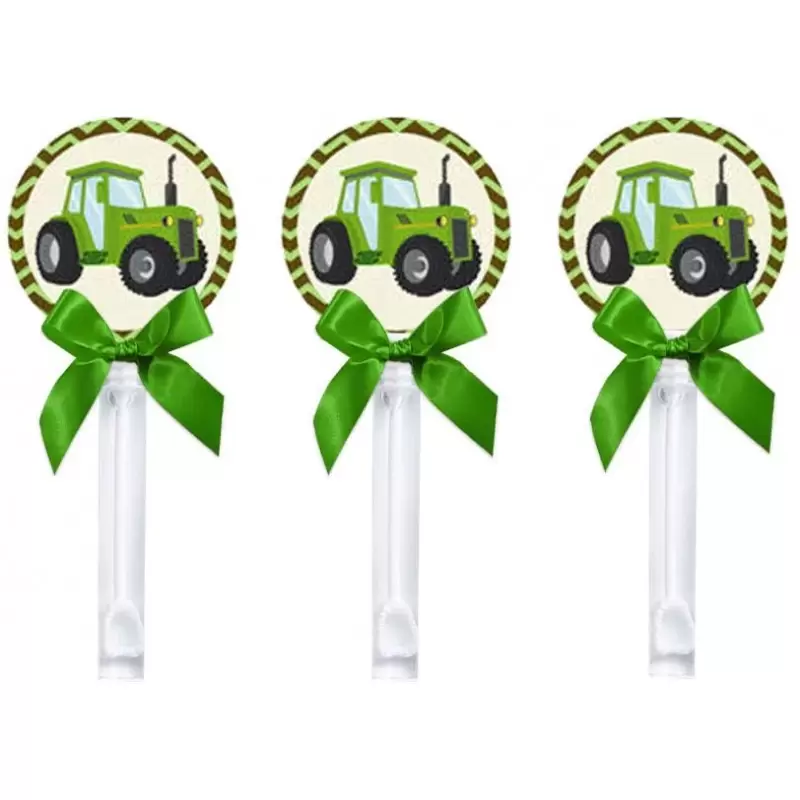 Riceverete il necessarioper creare delle bellissime bolle di sapone a tema trattore: 24 tubetti di bolle cuore bianche su cui applicare 48 adesivi tondi a tema. Ne potrete attaccare 2 per bolle (avanti e dietro). In più avrete un rotolo di nastrino verde per decorare