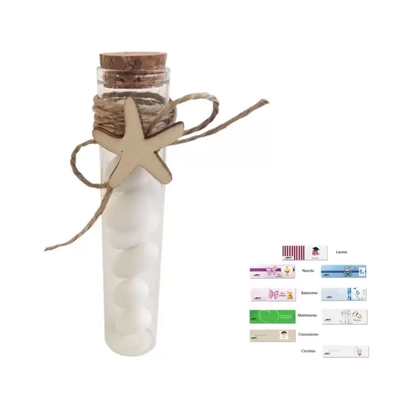 Riceverete tutto il necessario per assemblare 12 splendide bomboniere tema mare: 12 provette di vetro da 11,5 cm con tappo di sughero, 12 metri di jyta naturaòe, 12 decorazioni di legno a forma di stella, 12 bigliettino bomboniera.