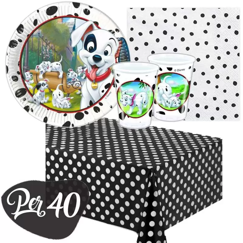 Bellissimo coordinato tavola a tema "La carica dei 101": 40 piatti da 23 cm in cartoncino alimentare, 40 bicchieri, 40 tovaglioli bianchi a pois neri irregolari e una tovaglia nera con pois bianchi!