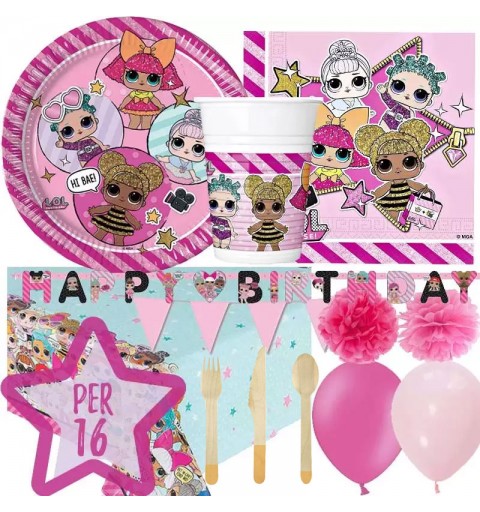 Un party unico e indimenticabile? Ovviamente in compagnia delle LOL con: 16 piatti da 23 cm, 16 bicchieri di plastica, 40 tovaglioli di carta da 33 x 33 cm, una tovaglia, bandierine rosa, ghirlanda, 3 fluffy pompon, 1 confezioni di posate in legno, 20 palloncini in lattice di due colori
