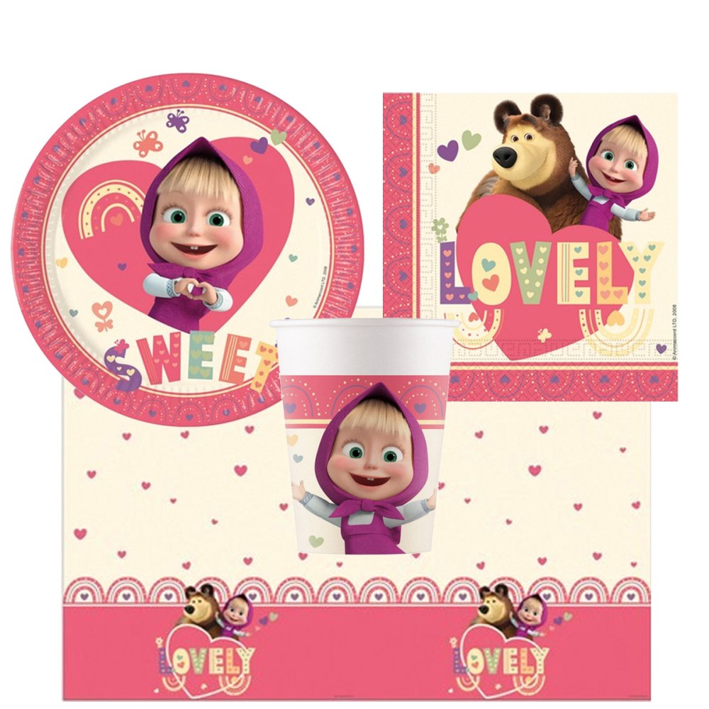 Kit compleanno coordinato tavola Mashe e Orso. Rendi colorato e divertente il compleanno della tua bambina con il kit compleanno ispirato al bellissimo cartone animato di Masha e Orso. Set completo di piatti bicchieri tovaglioli e tovaglia. Il kit perfetto per festeggiare in allegria e compagnia dei propri personaggi preferiti. Una festa magica grazie alla simpatia di Masha e Orso, il coniglio, i lupacchiotti e tutti gli animali della serie televisiva sulla vostra tavola.