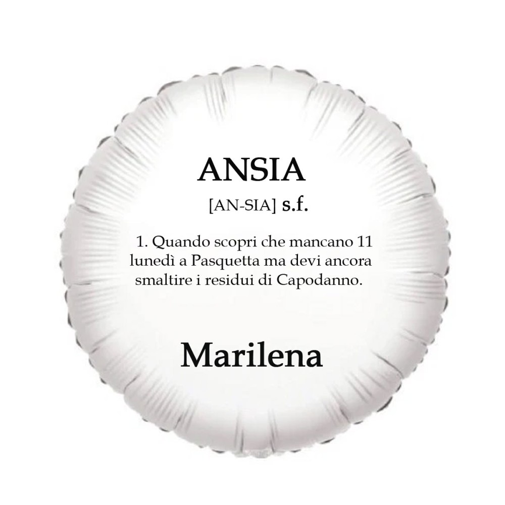 Palloncino foil con stampa a tema Ansia, con definizione simpatica e frase ironica e possibilità di personalizzazione, dimensione 43 cm circa. un modo facile ed economico per prendere in giro chi ami! il palloncino tondo può essere gonfiato sia con l'elio che ad aria!
