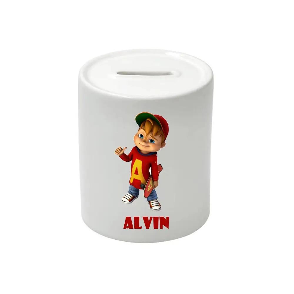 Salvadanaio in ceramica a tema Alvin. Tappo in plastica sul fondo per svuotarlo agevolmente senza doverlo rompere. Dimensioni Altezza 9,5 cm - Diametro 8 cm