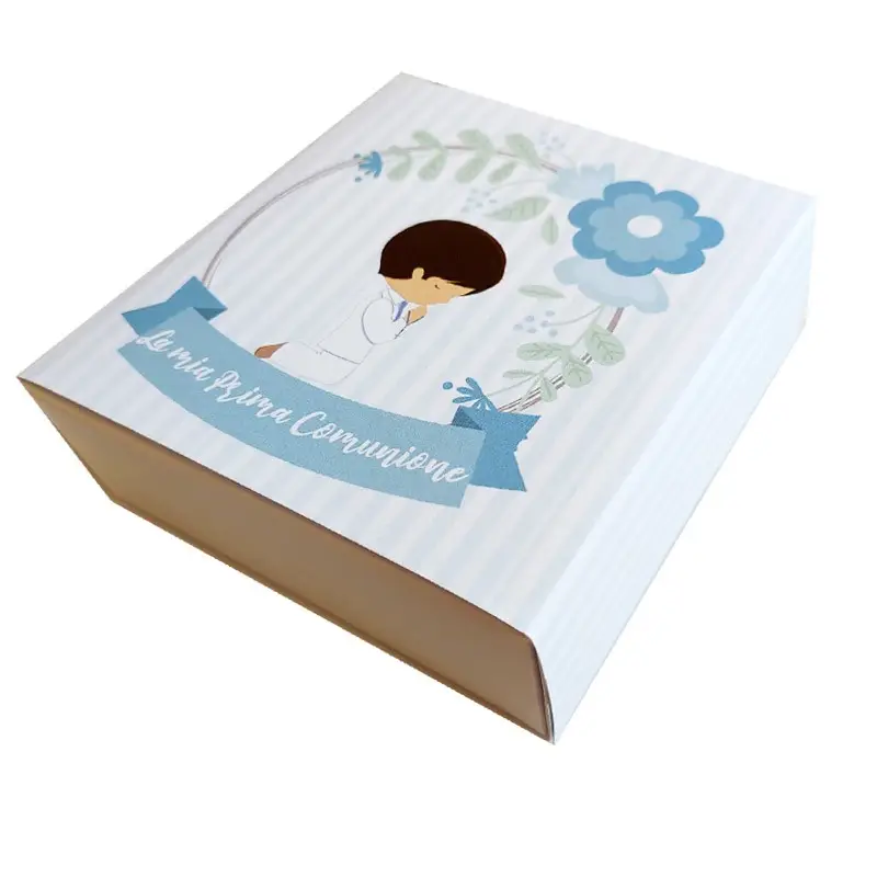Box degustazione, da assemblare ,in cartoncino semi rigido con apertura a soffietto. Perfetta come bomboniera e confettata per la prima comunione del tuo bimbo. Misure 12 x 12 cm