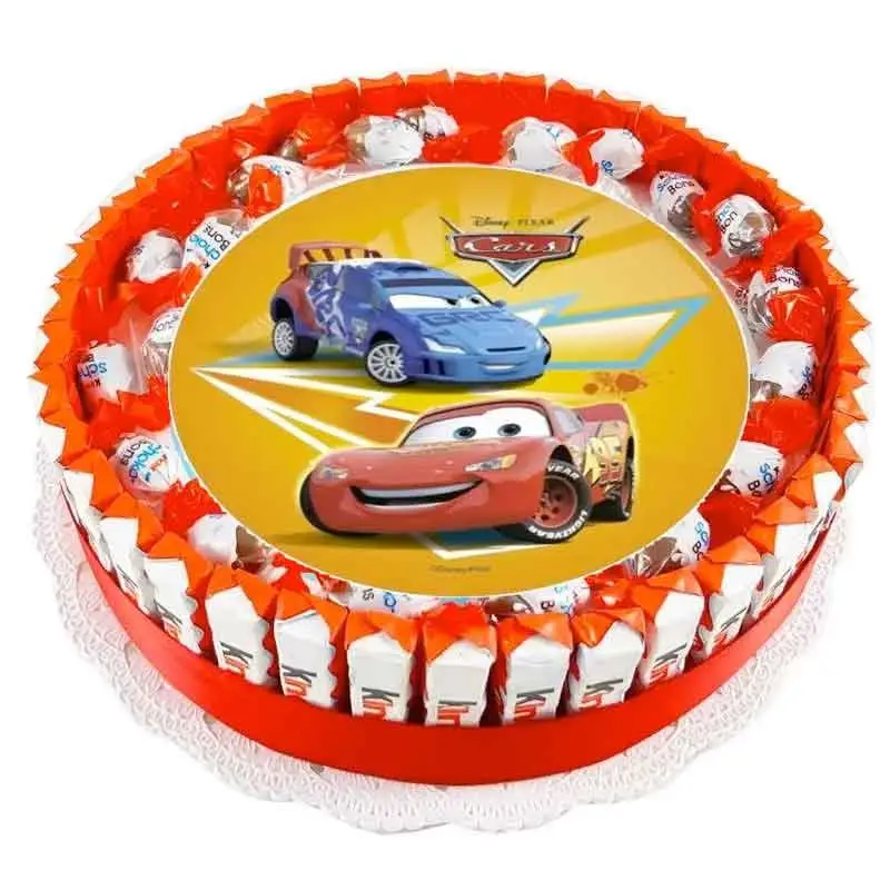 Riceverete tutto il necessario per realizzare a casa una torta Kinder: 48 barrette Kinder, una confezione di mini kinder bueno, una base in polistirolo da 25 cm di diametro e 5 di altezza, un vassoio trinato bianco, 1.5 mt di nastro doppio raso, un nastro biadesivo, cialda alimentare