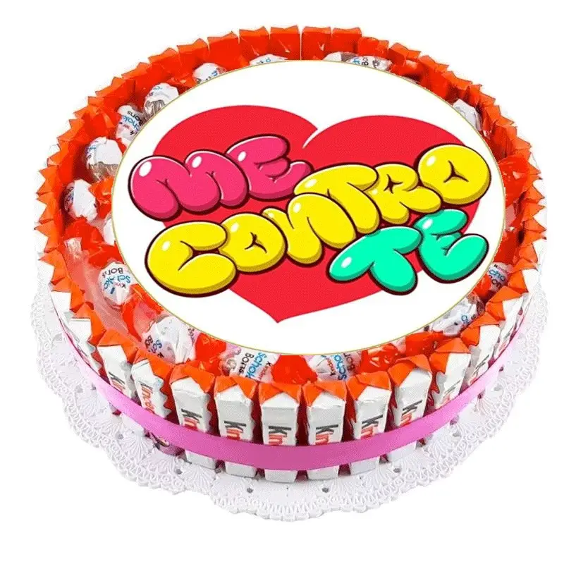 Riceverete tutto il necessario per realizzare a casa una torta Kinder: 48 barrette Kinder, una confezione di mini kinder bueno, una base in polistirolo da 25 cm di diametro e 5 di altezza, un vassoio trinato bianco, 1.5 mt di nastro doppio raso, un nastro biadesivo, cialda alimentare.