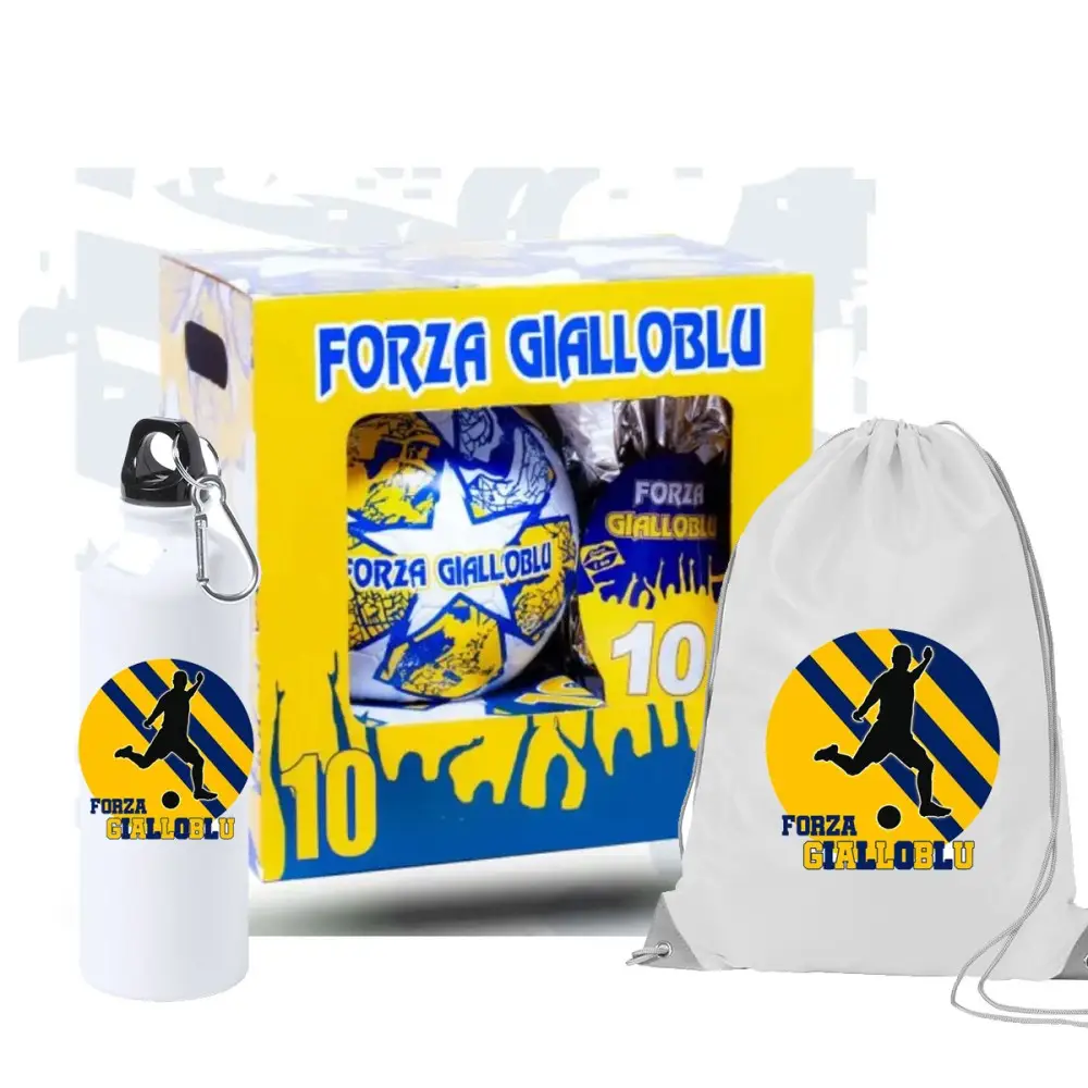 Uovo di Pasqua 150 g con i colori giallo blu con Pallone n.5 + borraccia alluminio + sacca nylon con stampa dei colori della tua squadra del cuore!