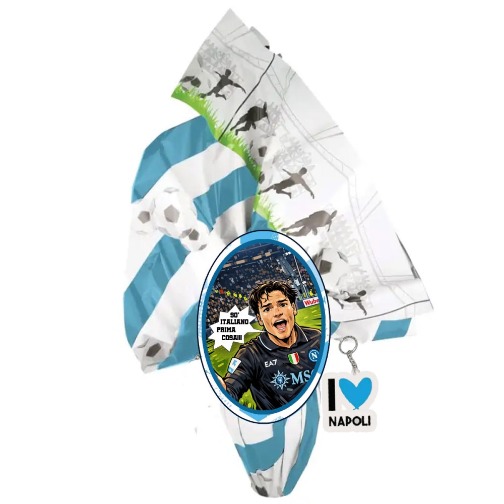 Non riesci a trovare l'uovo perfetto per un vero tifoso del Napoli ? o semplicemente vuoi stupire con un goloso uovo di cioccolato chi ami ? ecco a te un'idea originalissima. La pasqua 2026 sarà golosissima e super divertente con questo maxi uovo di cioccolato da 300gr con portachiavi.