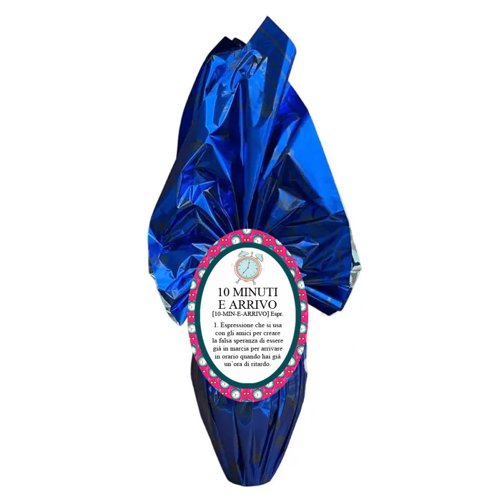 Non riesci a trovare l'uovo perfetto per la Pasqua 2026? o semplicemente vuoi stupire con un goloso uovo di cioccolato chi ami ? ecco a te un'idea originalissima. La pasqua sarà golosissima e super divertente con questo maxi uovo di cioccolato da 500gr con il collarino " 10 minuti e arrivo" con descrizione divertente, per il tuo amico ritardatario!!!