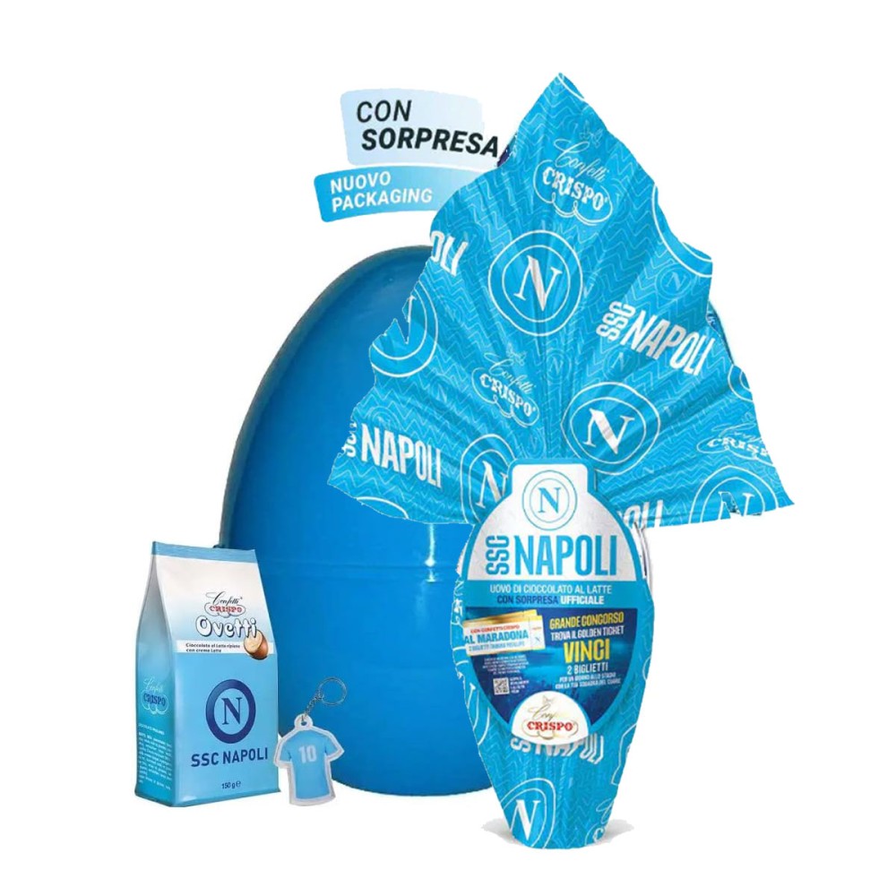 Riceverete 1 Simpatico guscio a forma di uovo da 38cm in cui inserire 1 Golosissimo Uovo di Pasqua del Napoli , una confezione di ovetti di cioccolato , 1 utilissimo portachiavi a forma di maglietta con numero 10.
